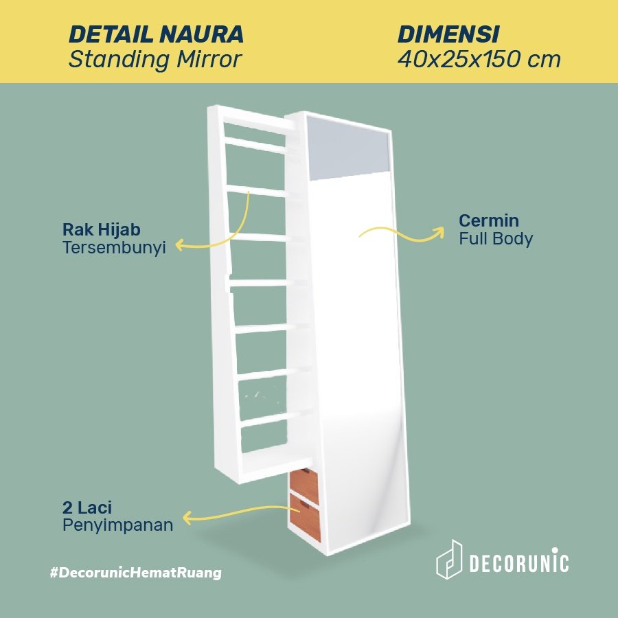 • Selain berfungsi sebagai standing mirror / cermin rias, juga untuk menyimpan jilbabmu biar tetap rapih. Selain itu kamu juga dapat menyimpan barang-barangmu seperti perlengkapan makeup, skin care, hingga pernak-pernik kesayangan ke dalam laci serbaguna.